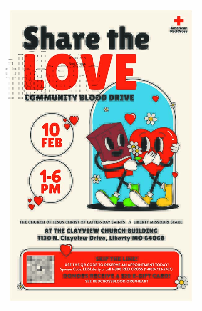 The Church of Jesus Christ of Latter-day Saints in Liberty, Missouri, invites the community to give blood on Tuesday, February 10, 2026. The blood drive, in partnership with the Red Cross, will be held from 1 pm – 6 pm at the church building located on 1130 N Clayview Drive.