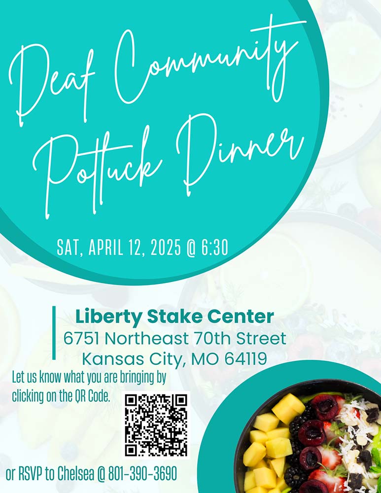 Our next activity is on April 12, 2025. We are doing a potluck at the Liberty Stake Center from 6:30 pm – 8:30 pm. Please sign up and bring something to the Deaf Community Potluck Dinner. There is an ASL session at the temple at 4:30 pm that same day, so the church building will be open from 3:00 pm – 4:15 pm if you are attending that session and would like to drop off your contribution before you attend the temple.
