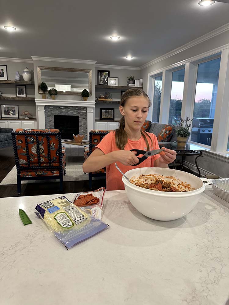 This evening the Relief Society & Young Women presidencies plus YW gathered together at Tami Coltrin’s house for a service project – assembling freezer meals to make life a little bit easier for a ward family currently preparing for a complicated birth. Together they produced four yummy meals – two pizza pasta casseroles, crockpot Hawaiian meatballs and taco soup.